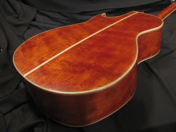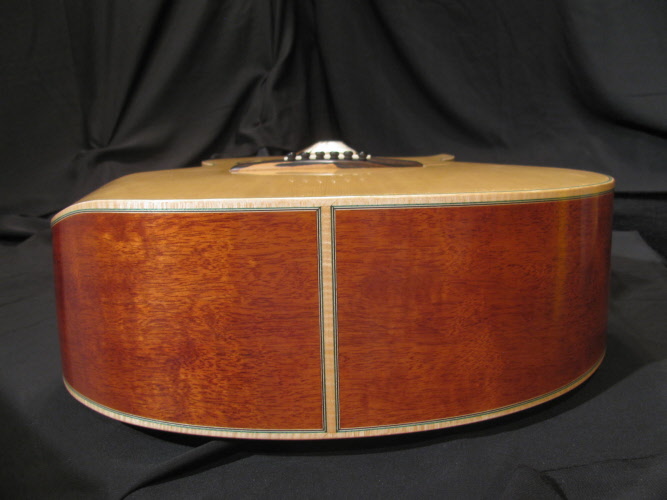 B&S; Figured Mahogany Tobacco tinted, Wedged from larger Bass to Narrower Treble sides. Side port with Sliding door for Sound projection & tonal response variation." why would anyone play with it closed?" Cuz you might want to mike it! out front !