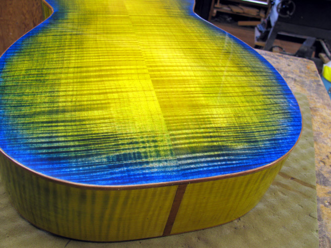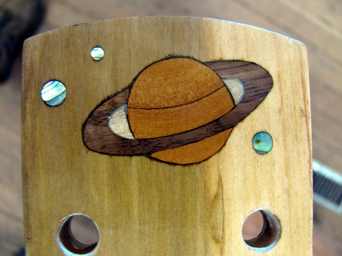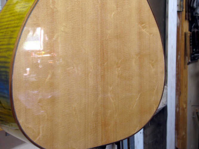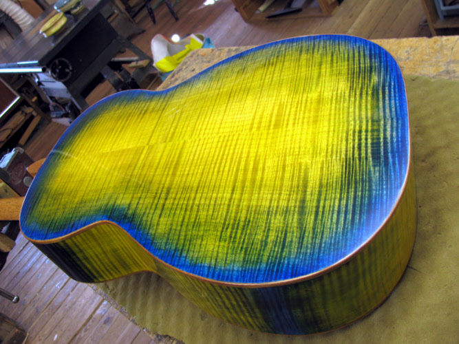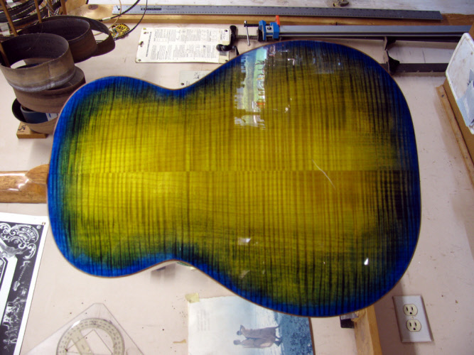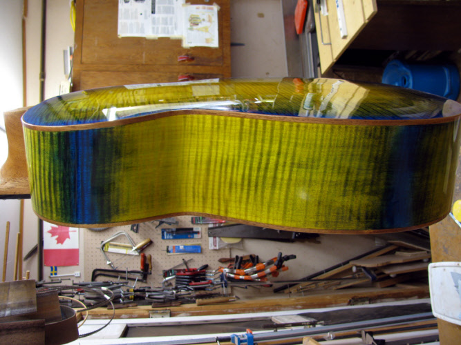 Curly Maple Back and sides with an Aqua burst color The blue has oxidized purple.Sitka Spruce top, S.A. Mahogany Neck. Ebony Fingerbd And Bridge with Standard Innotation. Bone nut and saddle.Aqua Burst Yellow streaming into Now Purple edges. Originally Blue the ultra violet light has oxidized the blue to purple. Even more striking!Inlay of Saturn with three of its moons.on the head. Gotoh SG38 tuners